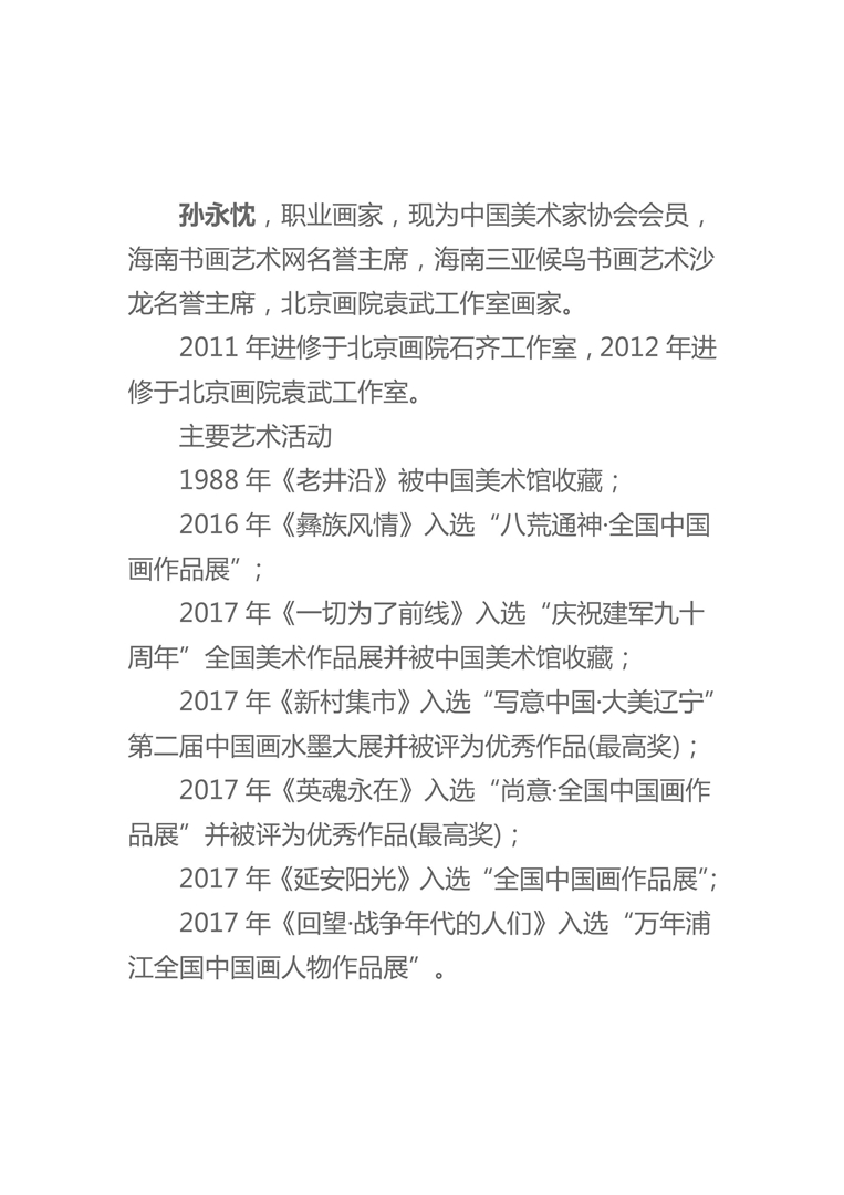 孙永忱,职业画家,现为中国美术家协会会员,海南书画艺术网名誉主席,海南三亚候鸟书画艺术沙龙名誉主席,北京画院袁武工作室画家。
